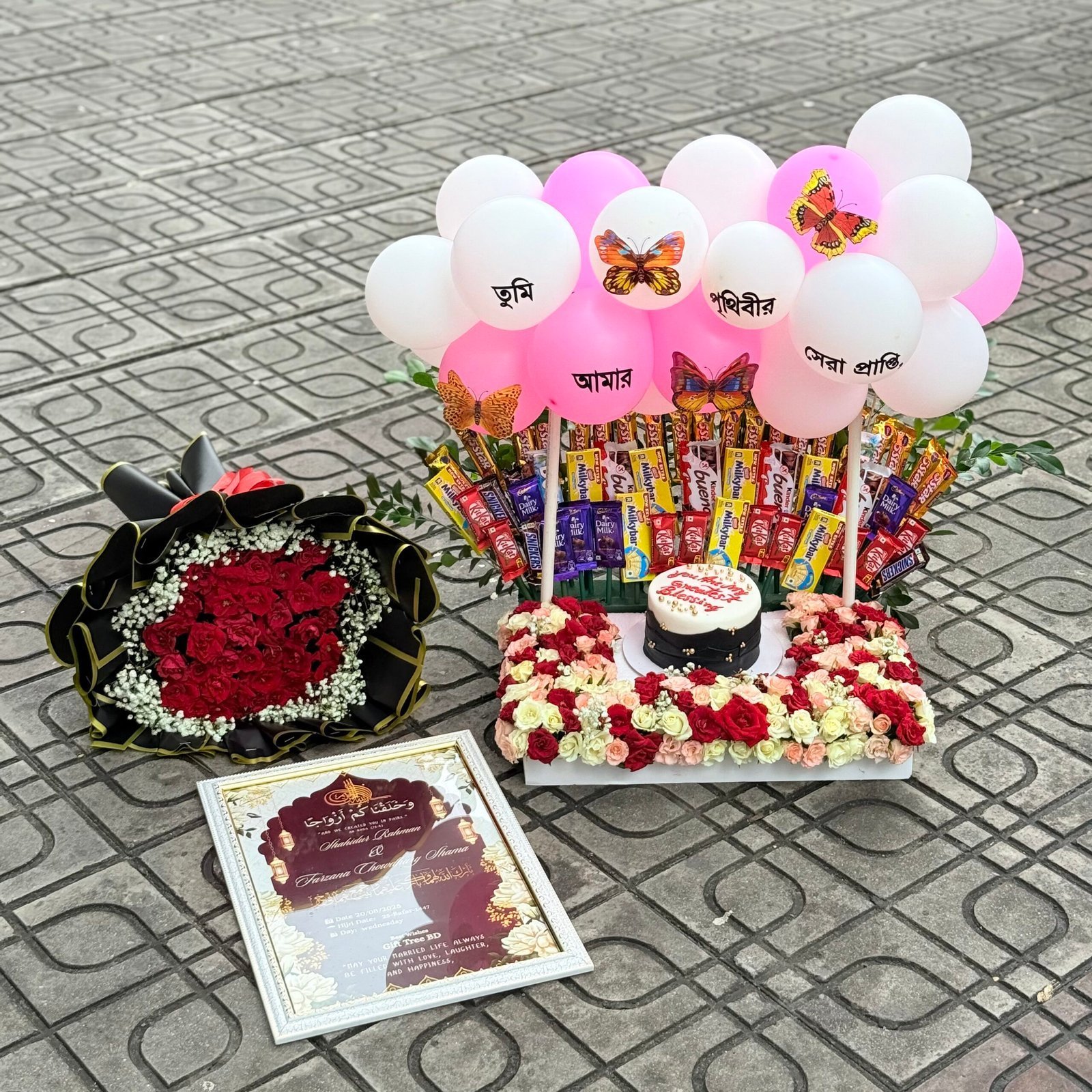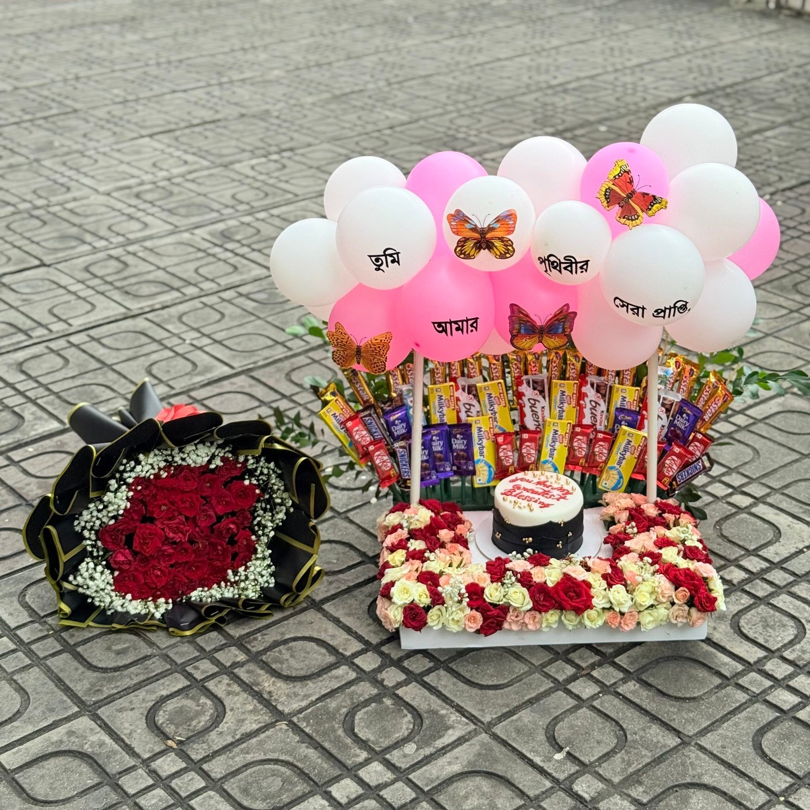 This premium set includes a stunning chocolate featuring KitKat, Dairy Milk, Perk, 5 Star, and more. It also comes with a custom-designed cake, a romantic red rose bouquet, printed balloons with special messages, and a beautifully crafted memory frame. The entire arrangement is presented on a tray decorated with fresh roses to create a breathtaking surprise.